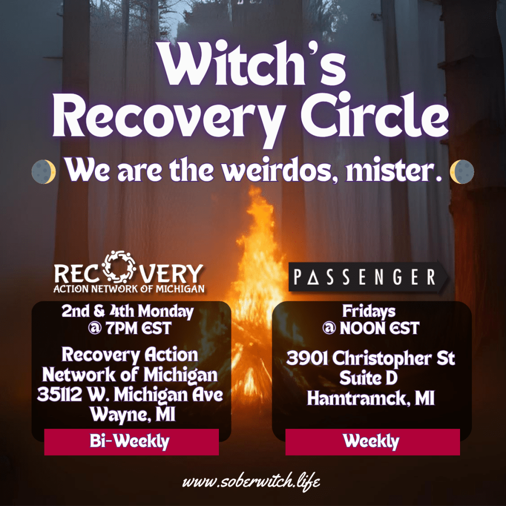 Meetings are held every 2nd and 4th Monday at 7 PM — join us in person at the RANMI Recovery Center or online via Zoom by subscribing to the Sober Witch’s Calendar.