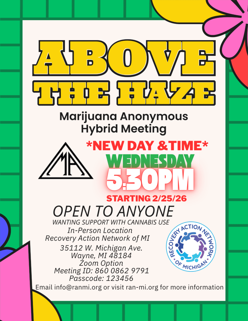 Above the Haze is a hybrid meeting of Marijuana Anonymous (MA), open to anyone seeking support in changing their relationship with cannabis. Using MA literature and the Twelve Steps, participants share experience, strength, and hope in a welcoming, non-judgmental space. The meeting takes place every Wednesday at 5:30 PM. Join us in person at RANMI’s Recovery Center or virtually via Zoom (click here for zoom link). There are no membership requirements—just a desire to stop using marijuana and build a life Above the Haze.