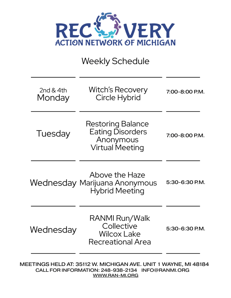 At Recovery Action Network of Michigan (RANMI), we provide a welcoming, judgment-free space where you can connect with peers, share honestly, and build practical tools for recovery. You are not alone—recovery is possible and community helps make it sustainable. Join us in person or online via Zoom (click here for Zoom link)!